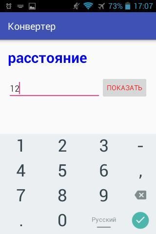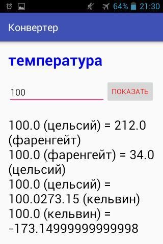 Конвертер работает с такими категориями величин как масса, расстояние и температура.Просто вводите необходимое число в поле для ввода выбрав нужную категорию нажатиями на соответствующую надпись и после нажатия на кнопку ПОКАЗАТЬ получаете результат в виде небольшого списка.