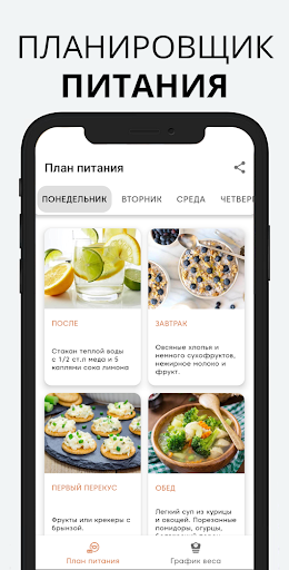 • Напоминания по приемам пищи - диетическое питание - устанавливайте время для каждого приема пищи и соблюдайте свой режим. Если вы хотите похудеть, постоянство и режим - основное правило. Приемы пищи не стоит пропускать.