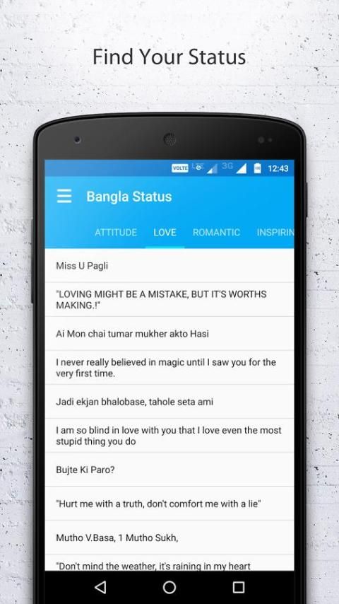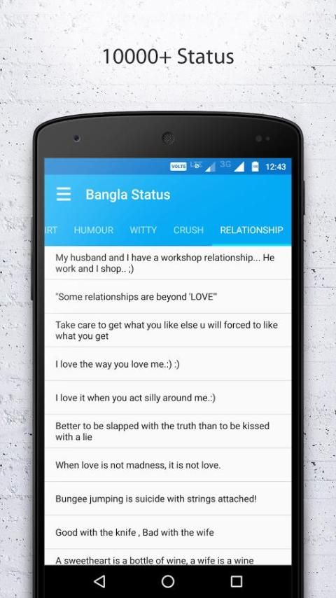 Bangla Статус действительно трудно найти статус, который не используется никем и original.So Здесь мы собрали некоторые из лучших, самым последним и нетронутый список для you.Which включает в себя статус, цитаты и многие more.This приложений регулярно обновляется так что следите за новыми дополнениями ...
