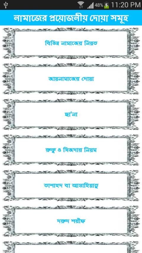 সঠিকভাবে নামাজ পড়ার জন্য আমাদের অনেক সূরা, দোয়া ও মাসায়েল জানার প্রয়োজন হয়. আমাদের এই অ্যাপ্লিকেশন টির মাধ্যমে খুব সহজেই চিত্র সহ সকল নামাজের সঠিক নিয়ম, সূরা, দোয়া ও মাসায়েল শিখতে পারবেন.