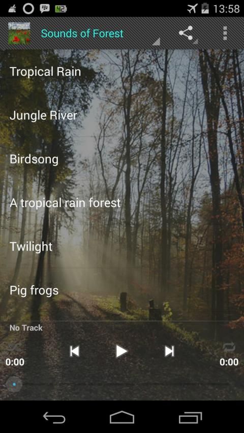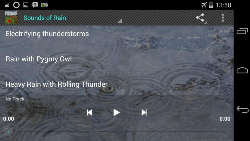 This application contains collection of natural sounds: thunderstorms, rain-showers, ocean waves, rivers and streams, songbirds in the morning, swampland at sunset The ultimate collection of environmental sounds for people who wish to hear something else other than the less-than-soothing sounds of bus horns, squealing tires, roaring engines, obnoxiously loud stereos, construction jackhammers, etc.