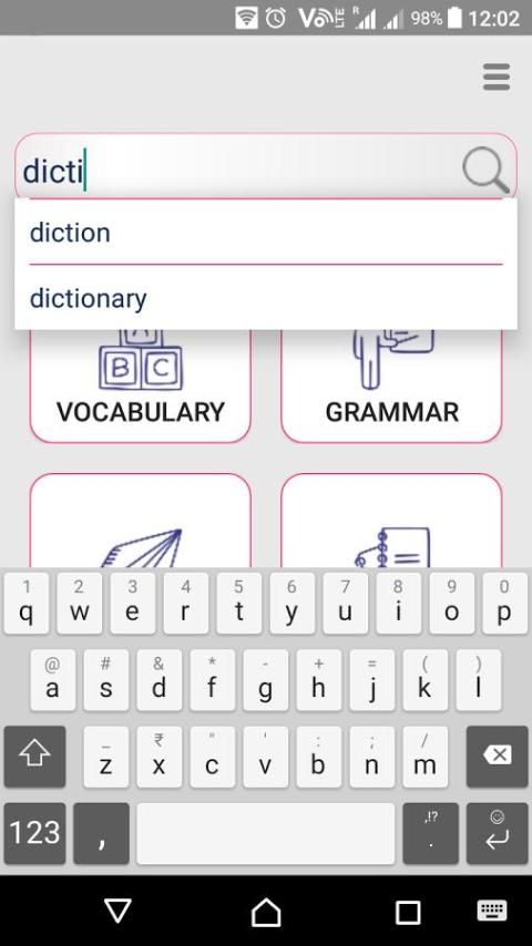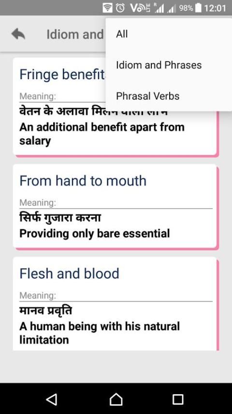 Это приложение содержит (от А до Z решения для английского языка), используемые в исследовании, как словарный запас, а также синоним и антоним, идиомы и фразы с фразовых глаголов, одной замены слов (с категориями мудрых) и краткое руководство по грамматике части на английском языке, а также использовать в качестве словаря для английского на хинди смысл.