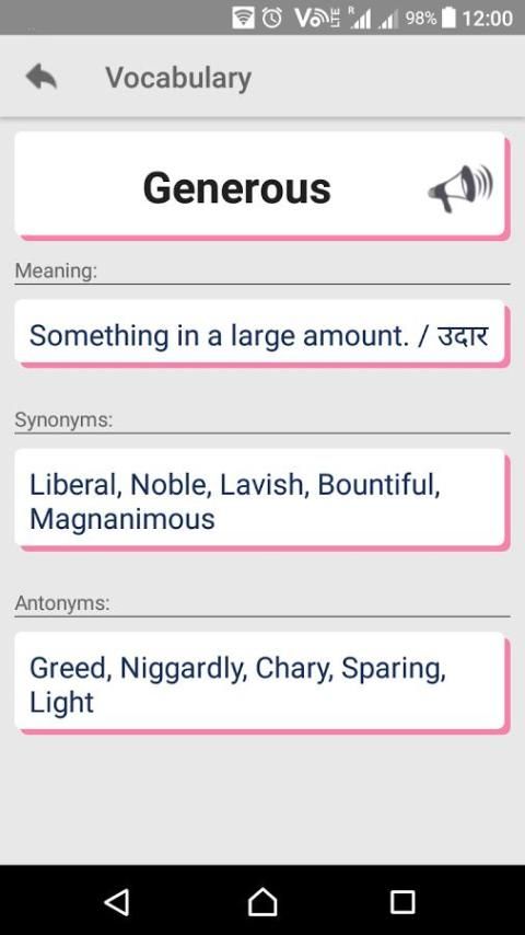 - 1000+ словарь с английским и хинди смыслом, а также синонимом и антонимом