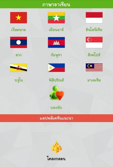 Применение "Английский Азии" представляет собой приложение для изучения. Подготовлено для пропаганды и просвещения о языках, используемых в каждой стране АСЕАН, а именно Бруней, Камбоджу, Таиланд, Мьянма, Лаос, Вьетнам, Филиппины, Малайзия, Сингапур и Индонезия. Это приложение упакован с Азии лексике, используемой в повседневной жизни страны вне. Примеры включают в себя использование лексики и ключ добавляется к встроенных речевых приложений. Разделенные на категориям терминов состоит в следующем.