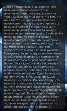 Добро пожаловать в Make money!. Наш сервис - это отличный способ заработать в интернете, ничего не вкладывая и не теряя.Суть заработка состоит в том, что вы качаете интересные бесплатные приложения с google play и открываете на своём Android-устройстве, а мы в свою очередь платим вам за каждое открытое приложение целых 5 рублей! Не плохо правда? В среднем каждое приложение весит по 3 мб.(некоторые больше, некоторые меньше)За пол часа вы можете без особых напрягов заработать 200, а то и больше рублей! Каждые сутки мы предоставляем новых 50 ссылок на бесплатные приложения!, качая по которые, Вы зарабатываете баллы. За каждую ссылку Вы получаете 5 баллов. Заработанные баллы Вы можете вывести, пополнив счет своего мобильного телефона. Один балл равен одному рублю. Минимальная сумма вывода - 25 рублей. Имейте в виду, что выводить средства можно только раз в сутки. В ближайшее время планируется расшириение функционала и добавление новых заданий. В нашей программе предусмотрены бонусы за ежедневное посещение. Полностью выполненные задания каждый день в течение пяти дней подарят вам бонус в виде 50 баллов Make Money.