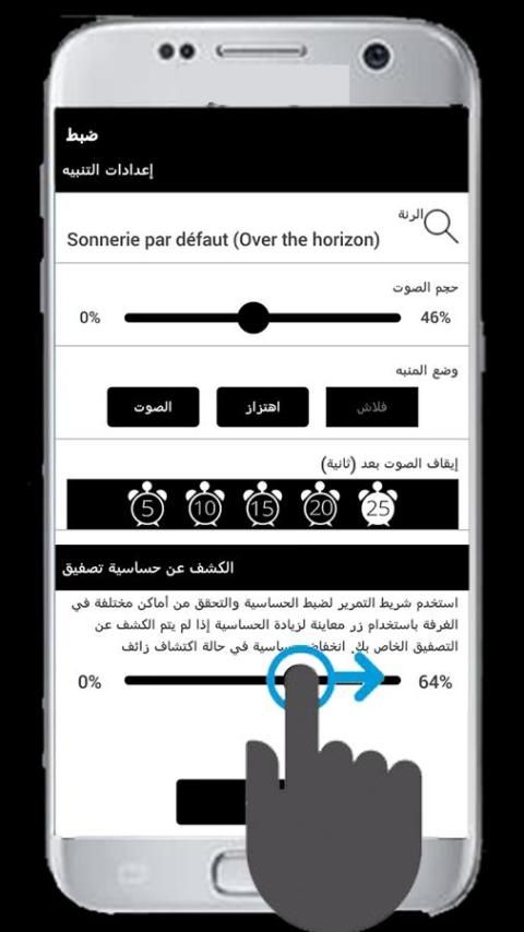 После загрузки приложения, где телефон и его вступление в должность, выбрать режим работы с помощью кнопки, показанной на первом экране после DALK нажмите кнопку настройки, затем выберите длительность сигнала тревоги и качества будильника и объема, была кнопка предварительного просмотра, вам будет предложено для заказа хлопать Он измеряет чувствительность звука.