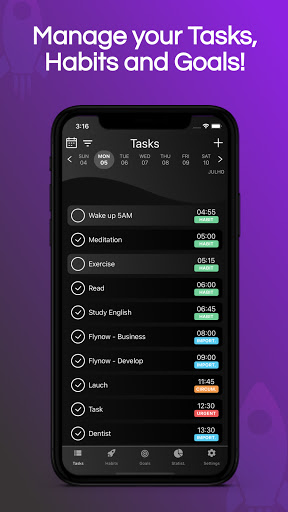 FlyNow - это идеальное приложение для тех, кто хочет улучшить свою производительность, управляя задачами, привычками и целями. Приложение использует лучшие методы управления задачами, привычками и целями. Кроме того, он использует Gamification для поощрения своих пользователей для выполнения их деятельности. Другим дифференциалом приложения является использование статистики для предоставления обратной связи пользователю относительно его производительности. Для управления временем / задач Приложение использует триад временного метода, для управления привычками Приложение использует привычную петлю. Наконец, чтобы выполнить управление целью, приложение использует интеллектуальный метод.