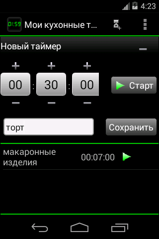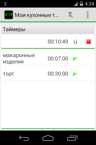 Мои таймеры приготовления позволяют сохранить некоторые таймеры и запустить их, когда вы готовите свои любимые рецепты.Аварийный сигнал будет звонить, когда время истекает время.