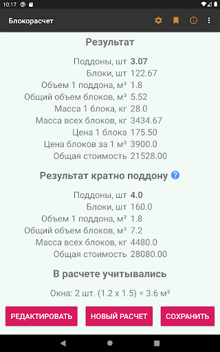* Кратно поддону - в этом расчете программа округляет количество поддонов в большую сторону до целого числа, и на основании этого делает альтернативный расчет основному. Обычно такой расчет нужен при покупке блоков с завода, когда нет возможности купить строительные блоки россыпью.