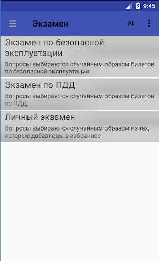 Приложение является помощником в подготовке к сдаче экзамена в ГосТехНадзоре для допуска к эксплуатации самоходных машин категорий AI - AIV.