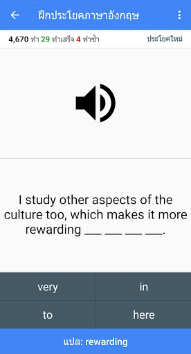 ฟังประโยคภาษาอังกฤษแล้วเลือกคำศัพท์แต่ละคำในประโยคให้ถูกต้อง คุณจะไม่เห็นคำแปลของประโยคภาษาไทยจนจบ