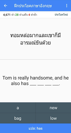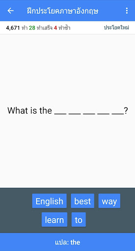 คุณจะเห็นประโยคภาษาไทยและคุณต้องเลือกประโยคอังกฤษที่ถูกต้องคำต่อคำ