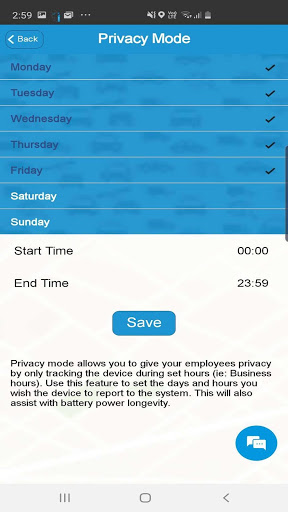 * Режим конфиденциальности. В рабочей среде большинству людей было бы неудобно сообщать о местонахождении за пределами рабочего времени. Чтобы решить эту проблему, мы включили «Режим конфиденциальности», который позволяет вам устанавливать дни и часы работы приложения. Приложение не будет записывать данные за пределами этих времен.