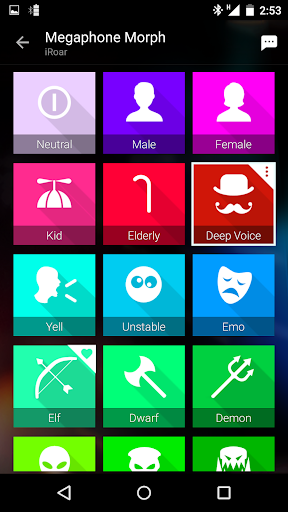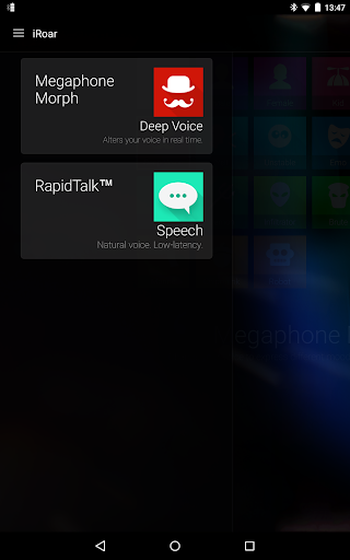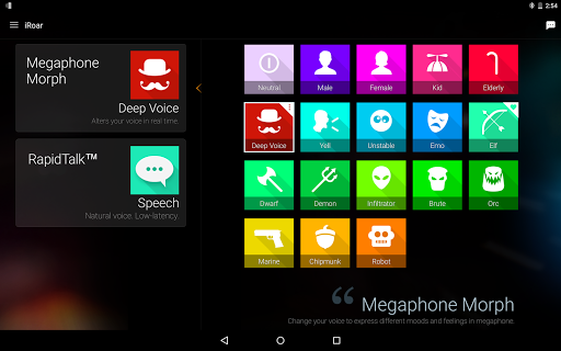 Мегафон iRoar имеет потрясающую функцию - Megaphone Morph, которая мгновенно может менять Ваш голос в голоса разных персонажей, чтобы Вы звучали как абсолютно другой человек. Попробуйте смешные голоса или звуковые эффекты, такие как мужской, женский, детский, пожилой голос и даже голос демона. Просто нажмите на доступный персонаж в приложении и начните говорить в микрофон iRoar!
