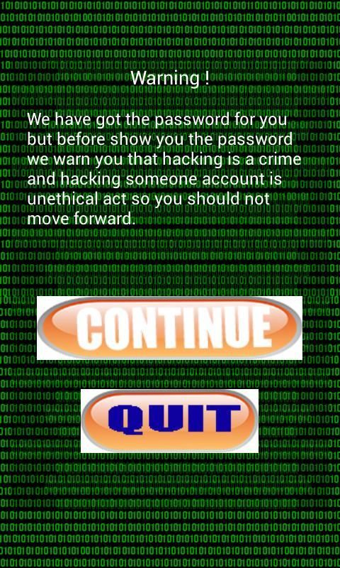 Это приложение является лучшим способом, чтобы обмануть ваших друзей или удивление. Быть хакером показать своему другу, что вы взломали их счет. Помните, это приложение не будет взламывать счета только ИКТ играть шалости и шутки. Пароли генерируются случайным образом. Таким образом, нет никакого способа, чтобы взломать учетную запись для реального в этом приложении.