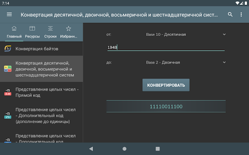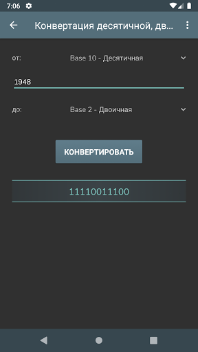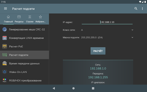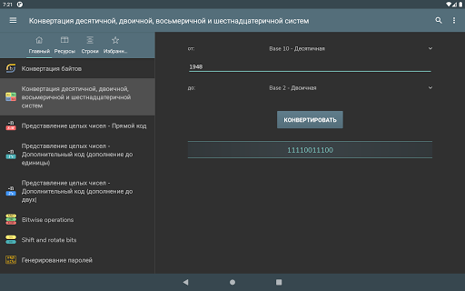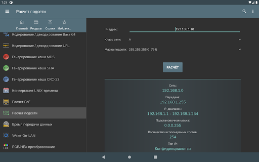 Конвертация байтов - Конвертация десятичной, двоичной, восьмеричной и шестнадцатеричной систем - Представление целых чисел: Прямой код, дополнение до единицы, дополнение до двух - Генерирование паролей - Генерирование случайных числел - Кодирование / декодирование Base 64 - Кодирование / декодирование URL - Генерирование хеша MD5, SHA, CRC-32 - Конвертация UNIX-времени - Расчет PoE - Расчет подсети - Время передачи данных - Пробуждение по локальной сети (Wake On LAN) - RGB/HEX преобразование - Время передачи данных - Побитовые операции- Смещение и поворот битов