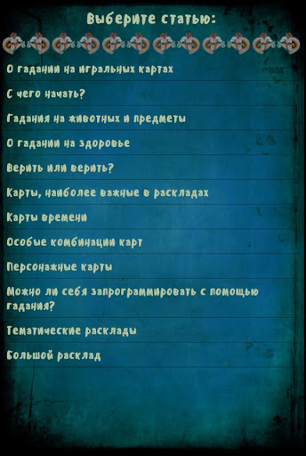 Приложение дополнено 13 авторскими статьями, которые помогут вам открыть для себя суть гадания на игральных картах, и эффективно применять их в своей жизни.