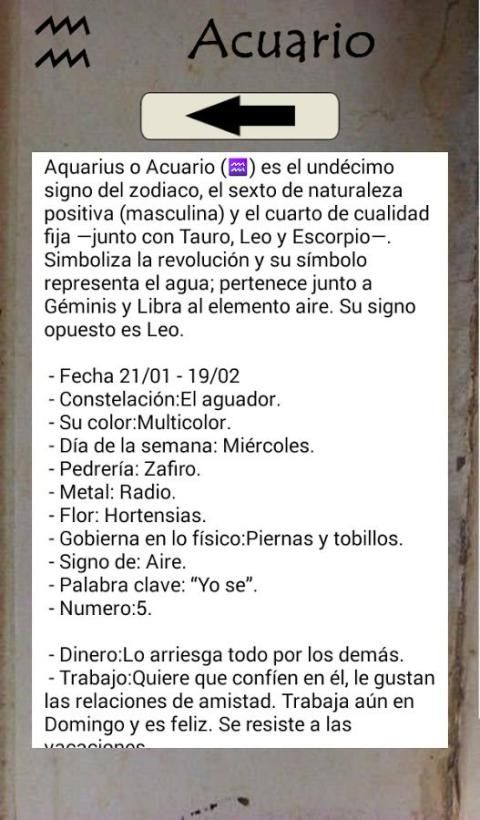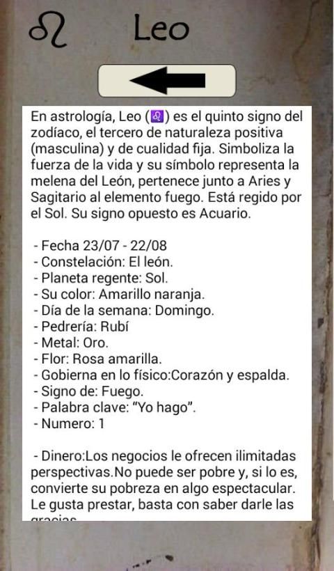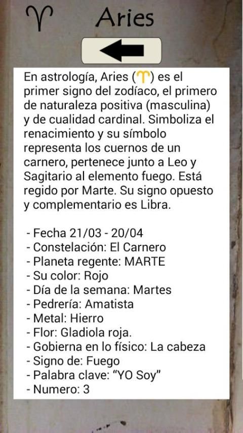 Знак Это приложение предоставляет информацию, чтобы обнаружить свое полное signo.Descubre ваш номер, цвет, правящая планета, камень, металл, цветок и ключевые слова. Она также обеспечивает небольшое пояснение денег, любви и работы личности.