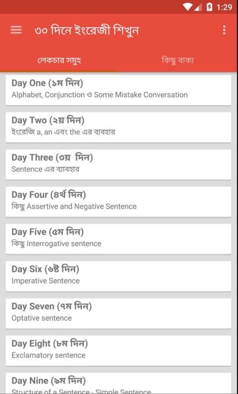 এই অ্যাপটি আমরা এমন ভাবে সাজিয়েছি যাতে আপনি 30 দিনে ইংরেজি ভাষা ভাল ভাবে শেখা যায়. তবে প্রতিদিন অনুশীলনের বিকল্প নাই. এই অ্যাপ এ কি কি আছে তা নিম্নরূপঃ
