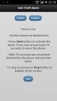 Protect your cell phone or tablet against thieves with this great app! The annoying & loud alarm will warn you if anyone try to touch your android device! How to use: - Set the volume at the desired level. - Press Start button to activate the alarm. From now on, you have ten seconds to leave the phone/tablet. - After 10 seconds, any movement detected by the phone/tablet will start the alarm. - To stop it, just press the Stop button at the bottom of the screen