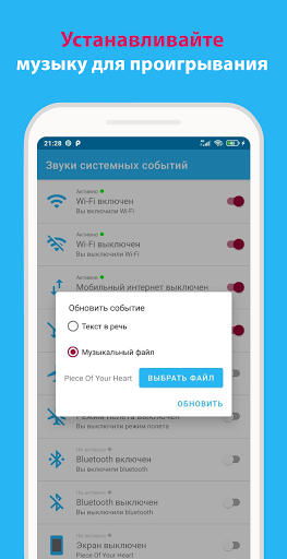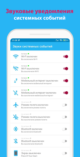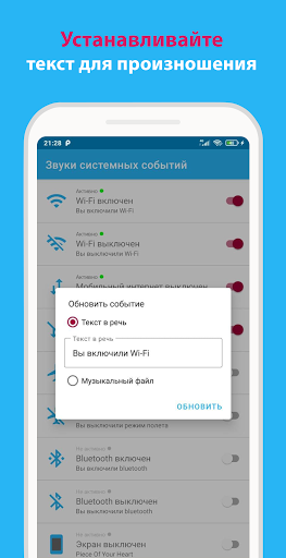 Настройте собственные звуковые уведомления для определенных системных событий. При срабатывании системного события приложение воспроизводит музыку или преобразует текст в речь. Например, вы можете настроить свой собственный звук, который будет воспроизводиться при включении экрана или bluetooth. В приложении можно найти более 20 системных событий!