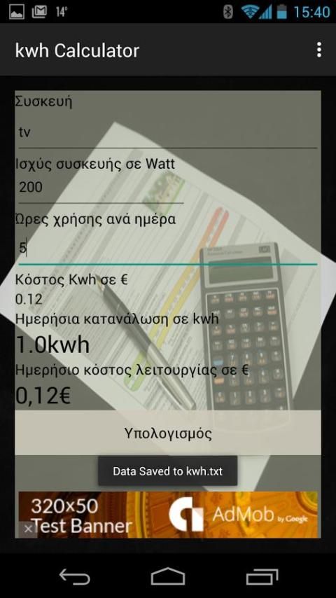 Μια απλή και εύχρηστη εφαρμογή για τον υπολογισμό της κατανάλωσης σε kwh και του αντίστοιχου κόστους σε ευρώ κάθε ηλεκτρικής συσκευής.