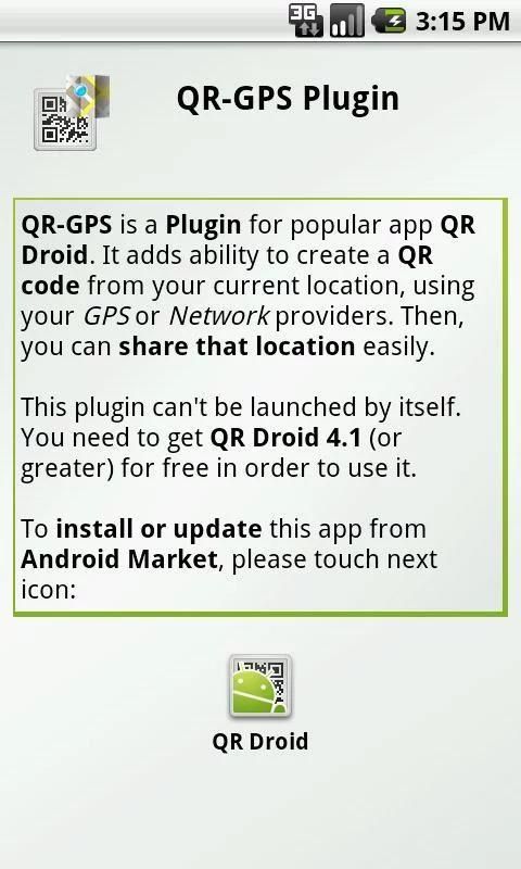 Этот плагин не может быть запущена сама по себе. Вы должны получить QR Droid 4.1 (или выше) бесплатно для того, чтобы его использовать.