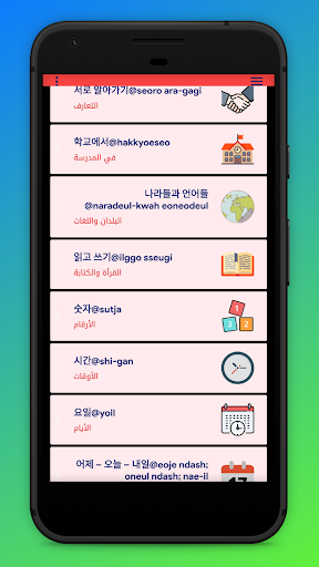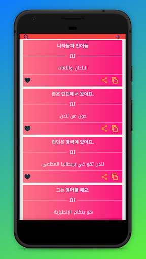 Application «Изучение корейского арабского языка» поможет вам говорить корейский язык в дополнении к известным фразам незаменимым на корейском языке, имена, цвет, и некоторые из правил, которые помогают корейский перевод на арабский язык.