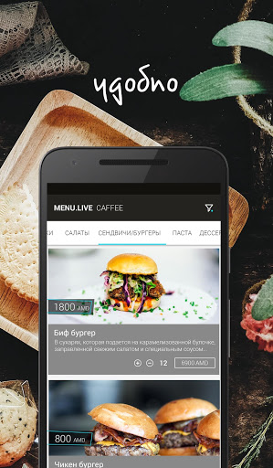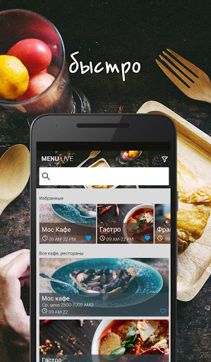 Menu Live представляет рестораны, их вкусные блюда вместе с информацией об ингредиентах, а также демонстрирует аппетитные фотографии. Удобное то, что вы можете заказать еду, узнать сумму заранее, а также позвать официанта, и попросить счет, оплату произвести наличными или кредиткой, только одним касанием пальца. Для быстрого выбора меню по ценовому диапазону, вегетарианской и еще не испробованным блюдам, имеется возможность использования функции фильтр. Дополнительно имеется возможность узнать время подготовки заказа. Более того, MenuLive представляет систему онлайн бронирования столиков с дистанционным заказом еды . Только представьте себе, теперь у вас есть возможность прибыть в ресторан вам удобное время, а вас будет ожидать ваш накрытый столик.Присоединяйтесь к нам и будьте готовы ко многим новым функциям и инновационным идеям, созданных только для вас.Наш продукт упростит, ускорит и сделает более комфортным ваше пребывание в ресторане.
