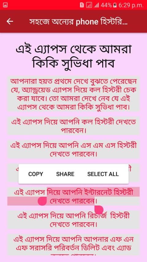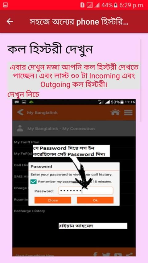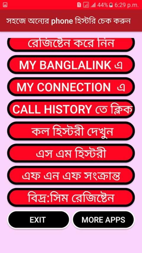 আপনারা হয়ত প্রথমে দেখে বুঝতে পেরেছেন যে, অ্যান্ড্রয়েড এ্যাপস দিয়ে কল হিস্টরী চেক করা যাবে. তো আমরা ... এই বার আপনি যে নাম্বার চেক করবেন সেই নাম্বার এর মেসেজ অপশনে গিয়ে টাইপ করুন REG এবং পাঠিয়ে দিন 9876 নাম্বারে. ... এবার এ্যাপস টা ওপেন করুন, এবার আমি আপনা দের জন্য তৈরী করে রেখেছি নিচে দেখুন.