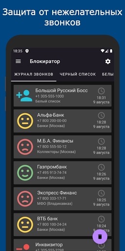 Избавьтесь раз и навсегда от нежелательных звонков коллекторов, банков, микрофинансовых организаций и прочего спама. Блокиратор защитит вас от нежелательных вызовов. Вы можете точно установить уровень защиты в соответствии с вашими потребностями: от простого уведомления о нежелательных вызовах до полной блокировки. Безопасно и совершенно бесплатно.