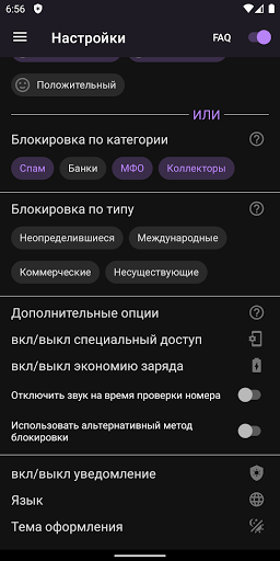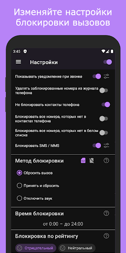 - Блокировка по времени, рейтингу и категории: банки, МФО, коллекторы, спам.