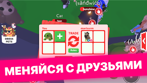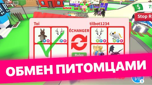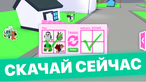 Pet trade для роблокс - мод, который добавляет в мир роблокса классных питомцев, которых можно обменять. Вы будете воспитывать их и заботиться о них. Как только вы зашли на карту для roblox adopt me, то присмотрите к покупке питомца. Вы можете выбрать любого, поэтому подумайте и решите, какого питомца вы хотите. Мод трейд животными для роблокс добавил очень много домашних животных, например тигр, зебра, пингвин или огромный слон. Кстати, если вы выберете пингвина, то когда будете передвигаться на нем, то он будет прыгать на живот и скользить! Со всеми питомцами по разному, например тигр быстро бегает, а птица сможет поднять вас в воздух. Иметь питомцы для роблокс очень круто, ведь с ними вы можете играть, веселиться и даже охотиться! Pet trade даст возможность легко торговать животными! Mod Adopt Me понравится каждому, поэтому скорее зовите своих друзей. Вы можете давать имя своему питомцу, чтобы легко его позвать. Когда ваш питомец вырос вы сможете запросто его продать или обменять на другого питомца в Адопт ми питомцы. Скачайте Pet trade для роблокс прямо сейчас!