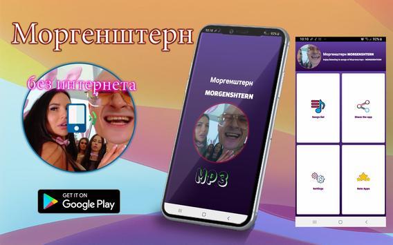 Чтобы слушать любимые песни повсюду, приложение "Моргенштерн без интернета песни и текст" содержит лучшие песни "MORGENSHTERN", без подключения к интернету и с высоким качеством звука.