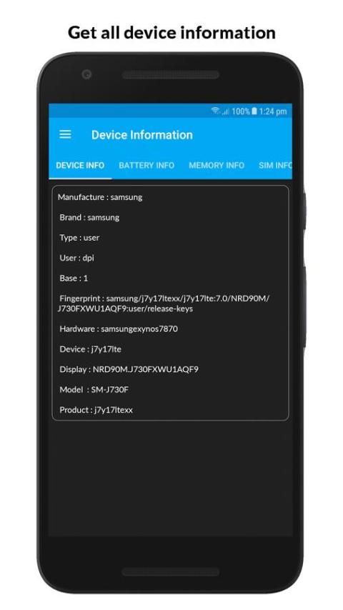 Информация об устройстве приложением является Colletion информации аппаратного устройства, информации о программном обеспечении устройства, информации OS устройства, информации о батарее устройства, памяти информации об устройстве и SIM-карте.