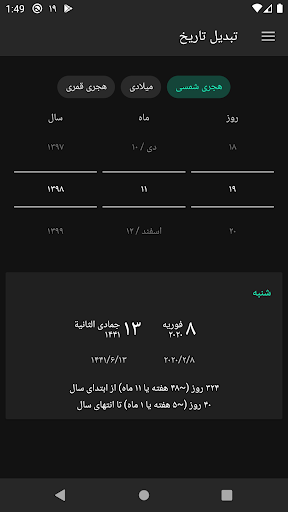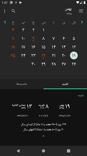 - Поддержка персидского, курьера, азербайджанца, жаилки, пушто, дари, арабского и английского языка - возможность быстро просматривать календари и движения между месяцами - просмотр Официальный праздник Ирана