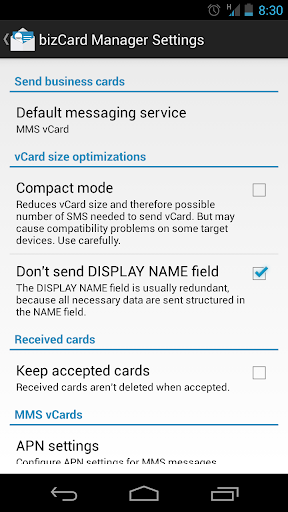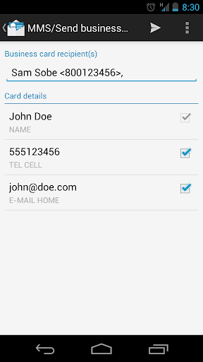 Можно отправлять VCards через MMS-сообщения с версии 2.0.0. Вы можете отправить MMS VCards на самые последние смартфоны, такие как iPhone, Nokia или другие устройства на основе Android.
