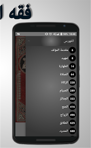 • بمجرد فتح قائمة التصفح في تطبيق فقه السنة يظهر لك الباب المفتوح حاليا بخلفية داكنة.
