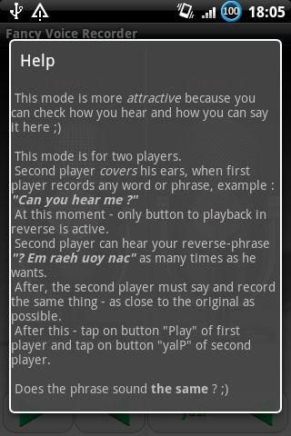 Это маленькое и простое приложение позволяет Вам записать Ваш голос и воспроизвести его. Более того - воспроизвести его "шиворот-навыворот". Более того - воспроизвести его голосом лилипута (подвиньте слайдер ближе к Fast) или демона (подвиньте слайдер ближе к Slow). ;) Вы можете использовать это приложение в двух режимах: Simple mode : позволяет записать Ваш голос и воспроизвести его. Fun mode : в этом более изощрённом режиме проверяется Ваш слух. Вы уверены, что можете повторить то, что сказано "шиворот-навыворот" ? ;) В этом режиме играют двое. Игрок №2 закрывает свои уши, в то время как Игрок №1 записывает своё слово или фразу, например слова "Тульский пряник" ;). После этого - Игрок №2 слушает в режиме "шиворот-навыворот" то, что сказал Игрок №1 - "Кинярп йиксьлут", и после этого пробует повторить это . Цель игрока - сказать это как можно ближе к оригиналу. После того, как Игрок №2 записал то, что он услышал, прослушайте обе версии - то, что сказал Игрок №1 в "нормальном" режиме и то, что сказал Игрок №2. Сравните - звучит одно и тоже ? :)