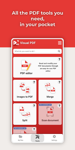 VisualPDF функция разделена на небольшие инструменты, что делает его легким для вас, чтобы найти правильный инструмент для вашей потребности. Мы делаем вашу жизнь еще проще благодаря поисковой строке, которая показывает вам, какой инструмент вам нужно в соответствии с действием вы должны сделать 🔍