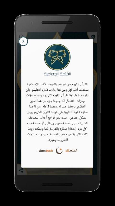 С точки зрения процесса идеи применения является чтение Корана день в массовом порядке. Там, где распределение Корана на части пользователей, каждый пользователь получает уведомление -kl Aom- напомнил ему о чтении, а также может видеть прогресс чтения от общего числа пользователей читают стихи и другие.