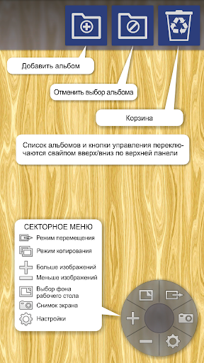 в контекстном меню фото, либо свайп на соседний стол, а также окончательно удалять свайпом вверх. Самые старые файлы в Корзине автоматически удаляются для поддержания допустимого размера Корзины (заданного в Настройках). Корзину можно очищать, используя контекстное меню, открываемое долгим тапом по кнопке Корзины на верхней панели.