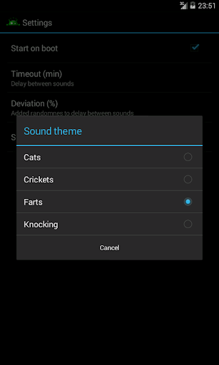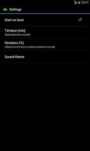 Start Launcher and install Nasty Sounds Services. Use Settings to select sound theme and time delay between sounds. Use Start and Stop buttons to control background service.