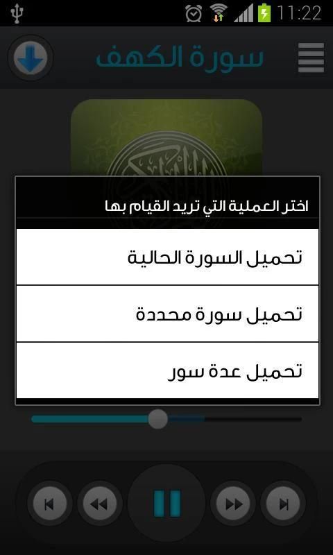 إمكانية تحميل السور على الجهاز. مما يمكنك من الاستماع للتلاوة دون الاتصال بالانترنت