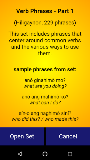 Speakin' Ilonggo is a language-learning app that focuses on sentence building. It contains over 2,300 Hiligaynon (aka Ilonggo) phrases with accompanying audio recorded by a native speaker from Negros Occidental, Philippines.