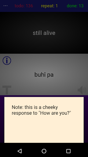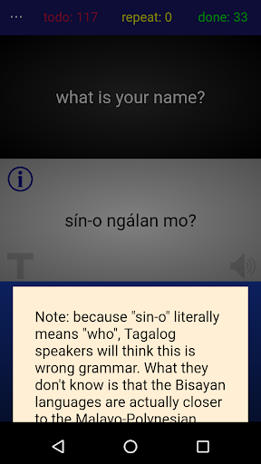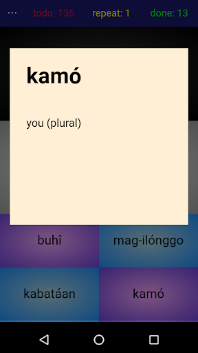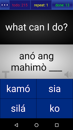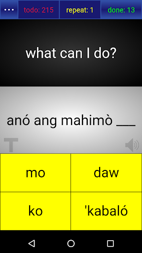 The app allows users to learn each sentence through trial and error. They are shown an English translation and tasked to build the corresponding Ilonggo phrase word by word. If they make a mistake, the phrase is automatically put in a "repeat" pile, and they will be given another chance sometime later to try again until they get it right.