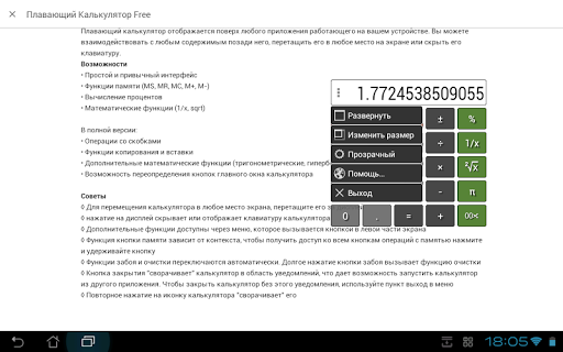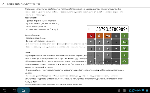 Калькулятор отображается поверх любого приложения работающего на вашем устройстве. Вы можете взаимодействовать с любым содержимым позади него, перетащить его в любое место на экране или скрыть клавиатуру калькулятора.