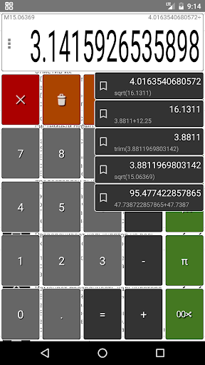 • Больше математики (тригонометрические: sin, cos, tan, arcsin, arccos, arctan, sinh, cosh, tanh, квадрат, куб, x в степени y, экспонента, степень десяти, квадратный корень, кубический корень, корень степени y из x, натуральный логарифм, десятичный логарифм, 1 на x, факториал, округление половины от нуля, округление вниз, π)