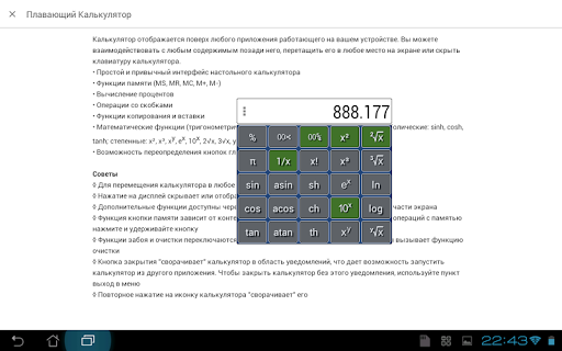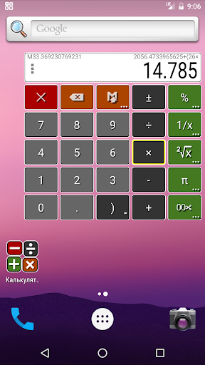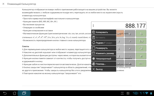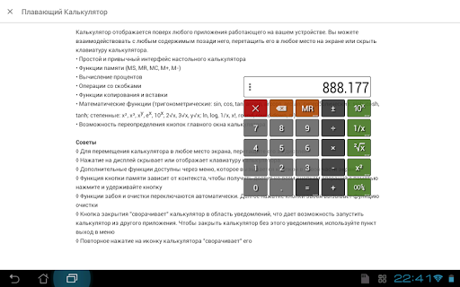 Калькулятор отображается поверх любого приложения работающего на вашем устройстве. Вы можете взаимодействовать с любым содержимым позади него, перетащить его в любое место на экране или скрыть клавиатуру калькулятора.