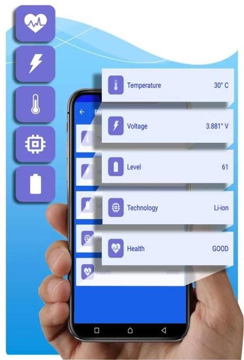 Подробная информация о батарее в главном окне приложения. вы сможете увидеть процент энергии батареи, а также температуру в ° С, напряжение батареи и, наконец, уровень.